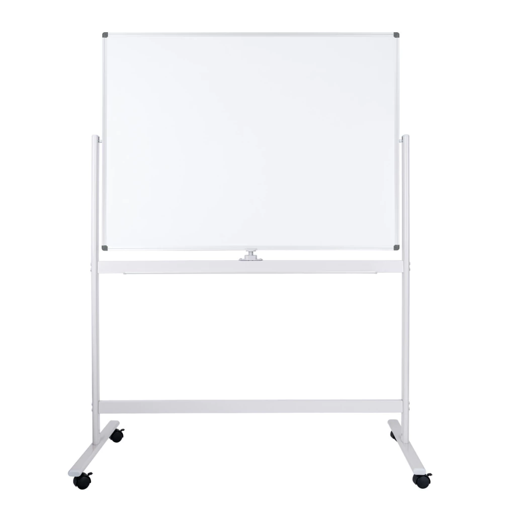 Pedestal con pizarra blanca doble faz magnética 90 x 180 Pedestal de caño estructural redondeado, terminación pintura Epoxi, 4 ruedas fijas que giran sobre sus ejes, bandeja fija, permite que la pizarra gire a 360°. Pizarras doble faz, magnética de fácil borrado, se escribe con marcador y se borra en seco. Superficie de acero galvanizado con 5 años de garantía sobre el buen uso. Marco de aluminio anodizado y Punteras protectoras de ABS.