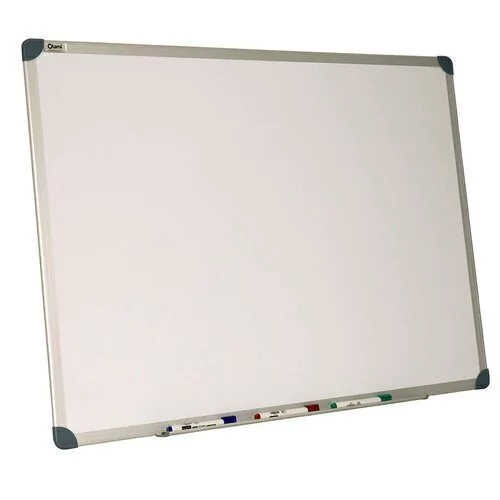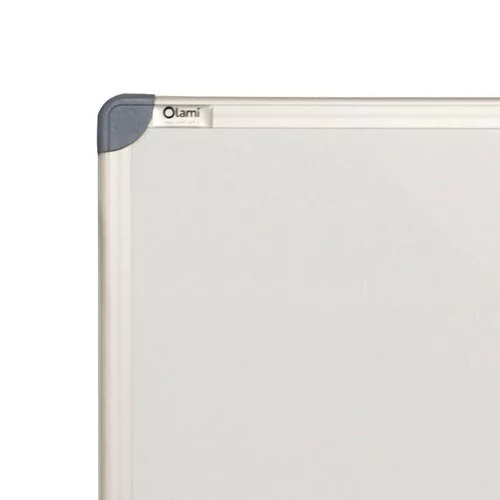 Pizarra blanca magnética 120x150 cm para escribir con marcador, superficie de chapa esmaltada a alta temperadura, de fácil borrado en seco. Marco de aluminio anodizado. Punteras protectoras de ABS. Incluye elementos de fijación a la pared y bandeja porta marcadores.