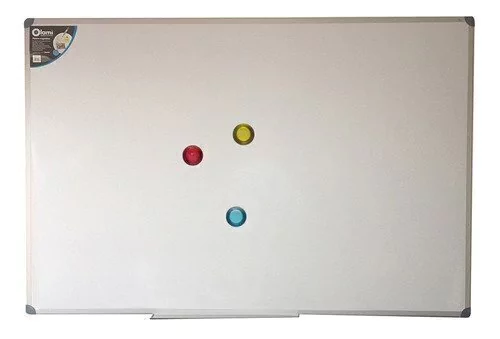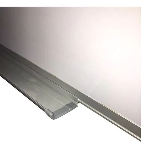 Pizarra blanca magnética 120x180 cm para escribir con marcador, superficie de chapa esmaltada a alta temperadura, de fácil borrado en seco. Marco de aluminio anodizado. Punteras protectoras de ABS. Incluye elementos de fijación a la pared y bandeja porta marcadores.