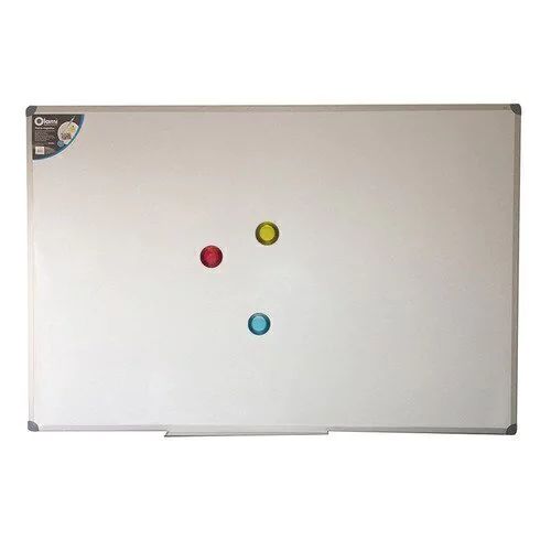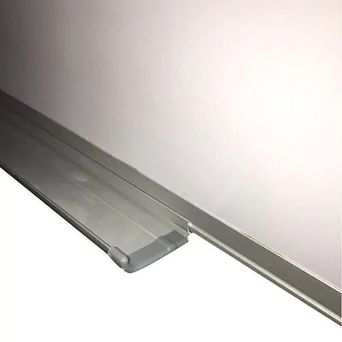 Pizarra blanca magnética 120x240 cm para escribir con marcador, superficie de chapa esmaltada a alta temperadura, de fácil borrado en seco. Marco de aluminio anodizado. Punteras protectoras de ABS. Incluye elementos de fijación a la pared y bandeja porta marcadores.