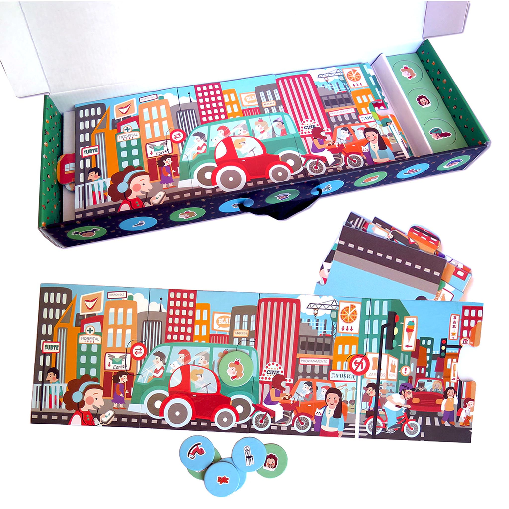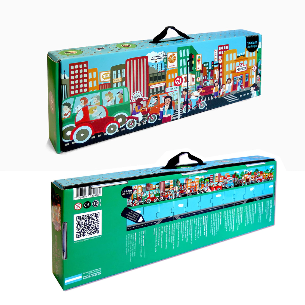 12 piezas para armar una ciudad larga en el piso y 24 fichitas para buscar personajes y objetos escondidos. Además, podés dibujar otro rompecabezas del lado de atrás. 144cm de largo.
